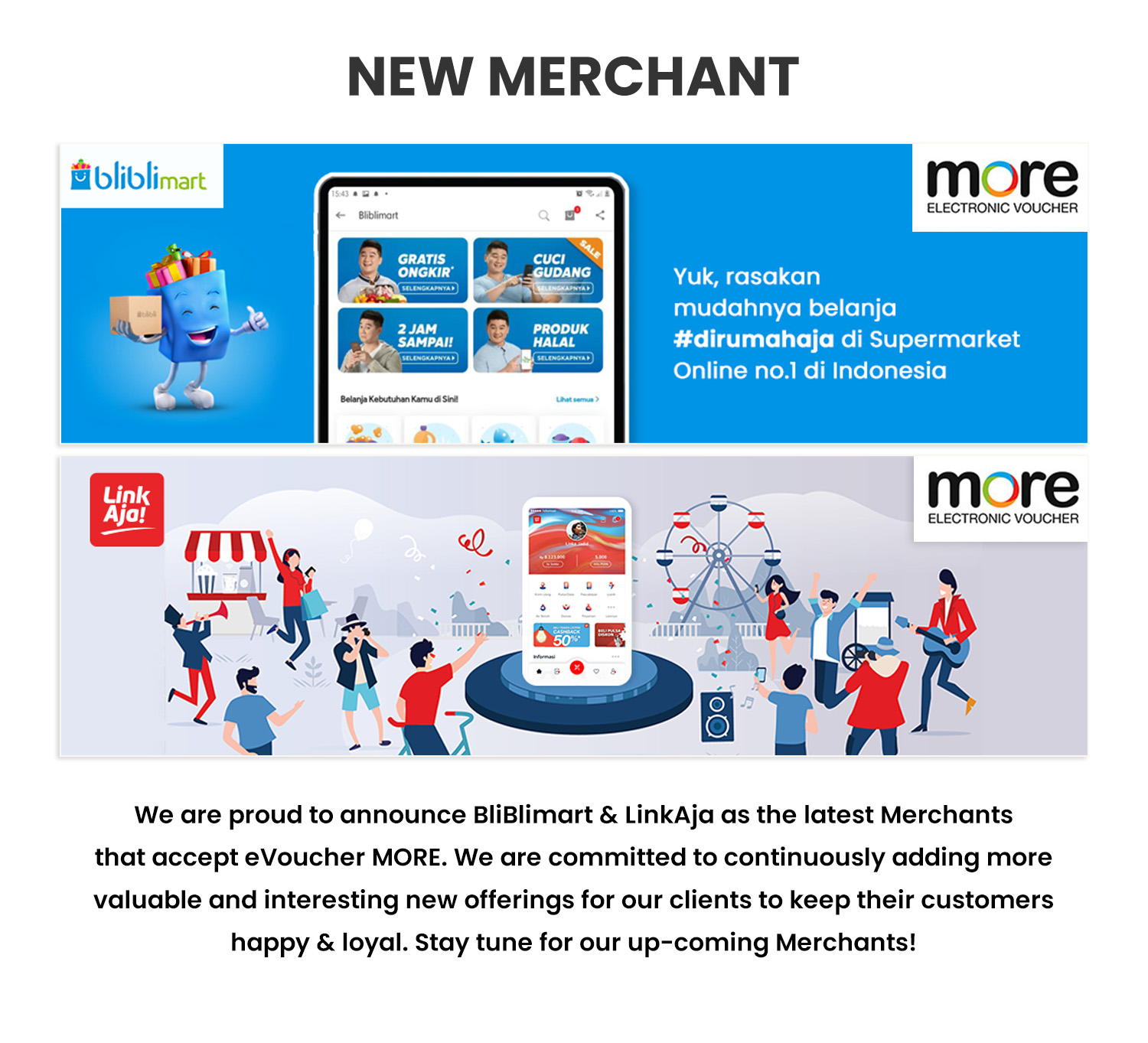 We are proud to announce BTPN Sinaya and Jenius as the new MORE E-Voucher's issuing partners. These additional partners from SMBC Group brings in dozens of reputable companies who can access to all of MORE 20,000+ popular merchant outlets across Indonesia.